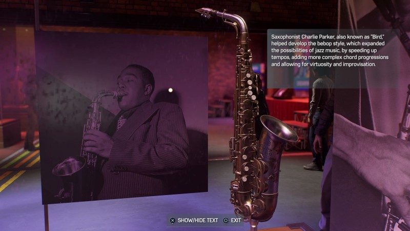 The culmination of this questline is what stuck with me in the weeks since playing. At the end of the day, the exhibit is restored, and the whole neighborhood is invited to celebrate the success. All the music history that had been hinted at is put on full display, literally – proper museum exhibits show off Charlie Parker's saxophone, Clyde Stubblefield's drum set, and a whole lot more. It's a quick but proper look into some of the biggest figures of the early 1900s jazz scene, complete with instruments, tap shoes, and poetry. As Miles explores the space, he mutters some Langston Hughes to himself, soaking in the words.